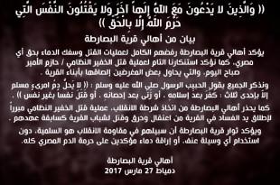 (( وَالَّذِينَ لا يَدْعُونَ مَعَ اللَّهِ إِلَهاً آخَرَ وَلا يَقْتُلُونَ النَّفْسَ الَّتِي حَرَّمَ اللَّهُ إِلَّا بِالْحَقّ )) بيان من أهالي قرية البصارطة يؤكد أهالي قرية البصارطة رفضهم الكامل لعمليات القتل و سفك الدماء بحق أي مصري ، كما نؤكد استنكارنا التام لعملية قتل الخفير النظامي / حازم الأمير اليوم ، …