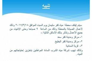 تنبيه سيتم قطع المياه لاعمال الصيانة بمركز ومدينة كفر سعد ومركز ومدينة كفر البطيخ وقرية السنانية ونهيب بالمواطنين باخذ الاحتياطات اللازمة بتخزين احتياجاتهم من المياه .