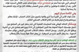 استنكر التحالف الوطني لدعم الشرعية بمركز ديرب نجم بالشرقية ، إطلاق قوات أمن الانقلاب، النار علي أحد مواطني قرية بهنيا التابعة للمركز والاعتداء علي والده رغم كبر سنه، فجر اليوم الأربعاء، واعتقال 6 من أبناء القرية، محملا “سلطات الانقلاب العسكري الإرهابي عواقب ممارسته الدموية، بما يجعل الأمور تخرج عن السيطرة، …