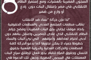 #نساء_ضد_الانقلاب بيان حركة “نساء ضد الانقلاب” “خرجوا بنات مصر” في الوقت الذي أصبح فيه عدد المعتقلات في السجون المصرية بالعشرات، مع استمرار النظام الانقلابي في مصر في اعتقال البنات دون رادع أو وازع من ضمير. لذا فإن حركة “نساء ضد الانقلاب” تطالب منظمات المجتمع المدني والمنظمات الحقوقية باتخاذ موقف إيجابي …