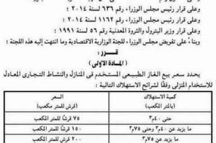 أصدرت حكومة الإنقلاب العسكري قرارا نشرته بالجريدة الرسمية بزيادة أسعار الغاز الطبيعي الواصل للمنازل على النحو التالي: حتى 40 متر مكعب :75 قرش للمتر المكعب. ما يزيد عن 40 متر مكعب وحتى 75 متر كعب :150 قرش للمتر المكعب. ما يزيد عن 75 متر مكعب :200 قرش للمتر المكعب. ويأتي …