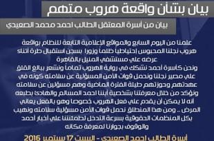 حملت أسر الطالب أحمد محمد الصعيدي، المعتقل بسجن استقبال طره، والذي أعلنت داخلية الانقلاب أمس هروبه من مستشفى المنيل الجامعي، سلطات الانقلاب المسؤولية الكاملة عن سلامته، وأهابت بكل المنظمات الحقوقية التدخل لطمأنتهم علي ابنهم أحمد، ومساعدتهم في معرفة مكانه. وقالت الأسرة- في بيان أصدرته مساء السبت-: إنها “علمت من …