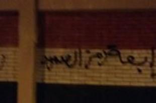 دشن أحرار دمياط حملة اسبراي على سور مدرسة الزراعة بباب الحرس بدمياط مع اقتراب ذكرى مجزرة فض رابعة وكتبوا عبارات”رابعة في القلب ،الدولار بكام،الخامات نار”.
