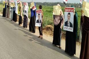 نظمت حركة نساء ضد الانقلاب بكفر سعد سلسلة بشرية صباح اليوم على طريق أم الرضا_جمصة وذلك ضمن فعاليات أسبوع “مكملين حتى ننتصر” . رفعت المشاركات الأعلام المصرية وعلامة رابعة رمز الصمود ولافتات “الثورة تجمعنا ” ،كما طالبن بالافراج عن بنات دمياط المعتقلات داخل سجون العسكر منذ أكثر من عام.