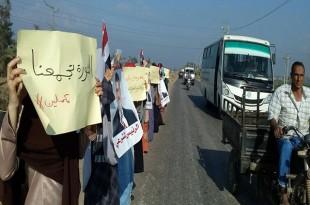 نظمت حركة نساء ضد الانقلاب بكفر سعد سلسلة بشرية صباح اليوم على طريق أم الرضا-جمصة الزراعي ضمن فعاليات أسبوع “اسمعوا صوت الغلابه”. رفعت المشاركات الأعلام المصرية وعلامة رابعة رمز الصمود وصور الرئيس الشرعي المعتقل د/محمد مرسي ،كما رفعن لافتات تطالب الإفراج عن بنات دمياط المعتقلات داخل سجون الانقلاب العسكري .