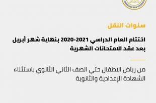 عاجل وزارة التربية والتعليم : نهاية شهر أبريل هي نهايه العام الدراسي للطلاب من رياض الأطفال حتي الثاني الثانوي.