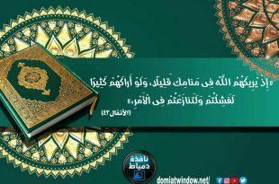آية ومعنى : {إِذْ يُرِيكَهُمُ اللَّهُ فِى مَنامِكَ قَلِيلًا، وَلَوْ أَراكَهُمْ كَثِيرًا لَفَشِلْتُمْ وَلَتَنازَعْتُمْ فِى الْأَمْرِ، وَلكِنَّ اللَّهَ سَلَّمَ أنه عَلِيمٌ بِذاتِ الصُّدُورِ} . (الأنفال٤٣)