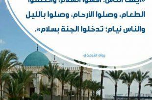 فقد حدث عبدالله بن سلام رضي الله عنه أنه سمع النبي صلى الله عليه وسلم أول مقدمه المدينة مهاجرًا يقول: «أيها الناس: أفشوا السلام، وأطعموا الطعام، وصلوا الأرحام، وصلوا بالليل والناس نيام؛ تدخلوا الجنة بسلام».(رواه الترمذي) فهذا الحديث الصحيح قد تضمن إرشاد المسلمين إلى تحقيق أربع خصال من خير خصال …