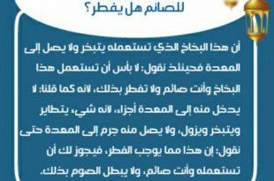 ـ استعمال بخاخ ضيق النفس للصائم هل يفطر؟ هذا البخاخ الذي تستعمله يتبخر ولا يصل إلى المعدة فحينئذ نقول: لا بأس أن تستعمل هذا البخاخ وأنت صائم ولا تفطر بذلك، لأنه كما قلنا: لا يدخل منه إلى المعدة أجزاء، لأنه شيء يتطاير ويتبخر ويزول، ولا يصل منه جرم إلى المعدة …