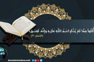 “وَلاَ تَأْكُلُواْ مِمَّا لَمْ يُذْكَرِ اسْمُ اللّهِ عَلَيْهِ وَإِنَّهُ لَفِسْقٌ وَإِنَّ الشَّيَاطِينَ لَيُوحُونَ إِلَى أَوْلِيَآئِهِمْ لِيُجَادِلُوكُمْ وَإِنْ أَطَعْتُمُوهُمْ إِنَّكُمْ لَمُشْرِكُونَ” .. (الأنعام 121) “ولا تأكلوا مما لم يُذكر اسم الله عليه” بأن مات أو ذبح على اسم غيره وإلا فما ذبحه المسلم ولم يسم فيه عمدا أو نسيانا فهو حلال …