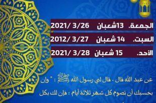 أقبلت الأيام البيض لشهر شعبان الذي ترفع فيه الأعمال إلي اللهالخميس 3/25 يوم ترفع فيه الأعمالالجمعة 3/26 اول الأيام البيضالسبت 3/27 ثاني الأيام البيضالأحد 3/28 ثالث الأيام البيضالاثنين 3/29 يوم ترفع فية الأعمال – قال رسول الله صلى الله عليه وسلم: “مَن صام يومًا في سبيلِ اللهِ، باعد اللهُ منه …