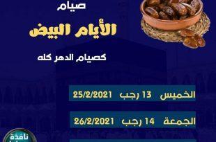 جاء عن عُبَيْدُ اللَّهِ عَنْ زَيْدِ بْنِ أَبِي أُنَيْسَةَ عَنْ أَبِي إِسْحَاقَ عَنْ جَرِيرِ بْنِ عَبْدِ اللَّهِ عَنْ النَّبِيِّ صَلَّى اللَّهُ عَلَيْهِ وَسَلَّمَ قَالَ: (صِيَامُ ثَلاثَةِ أَيَّامٍ مِنْ كُلِّ شَهْرٍ صِيَامُ الدَّهْرِ وَأَيَّامُ الْبِيضِ صَبِيحَةَ ثَلاثَ عَشْرَةَ وَأَرْبَعَ عَشْرَةَ وَخَمْسَ عَشْرَةَ) رواه النسائى وصححه الألبانى، وقال حديث حسن