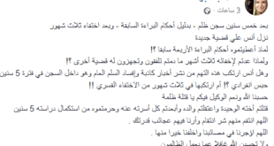 انتقدت سناء عبد الجواد، زوجة الدكتور محمد البلتاجي، عضو برلمان الثورة، تلفيق سلطات الانقلاب قضية جديدة لنجلها “أنس” بعدد إخفائها قسريا لعدة أشهر عقب حصوله علي براءة من اتهامات سابقة. وكتبت عبد الجواد، عبر حسابه علي فيسبوك، “بعد خمس سنين سجن ظلم – بدليل أحكام البراءة السابقة – وبعد اختفاء …